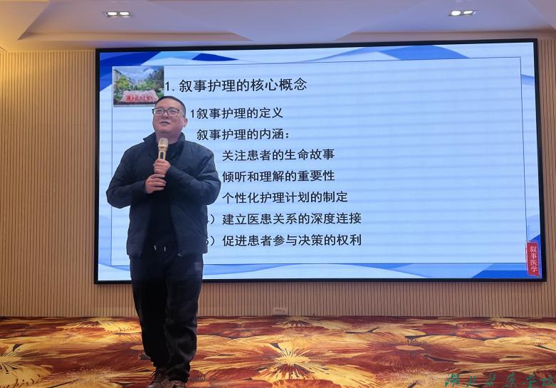 习近平总书记强调“要讲好中国故事,构建中国叙事体系”,将故事作为叙事实践,一个个病患的生命故事汇聚了医疗故事方方面面。这些医疗故事不仅仅是个体经历的展现,更是医院与社会相互联系的纽带,构建了我国医院叙事生态的一个重要组成部分。湖北医药学院叙事医学研究所程红平老师两天的讲授就是围绕什么是叙事护理?怎样践行叙事护理?如何让叙事护理助力护理高质量发展?两天的课程分为八个模块:模块一:叙事护理导论与发展历程、模块二:基础技巧与原理、模块三:实践操作:倾听与记录、模块四:沟通技巧与关系建立、模块五:叙事护理实施步骤、模块六:平行叙事病历、模块七:结业评估与展望和模块八:闭幕典礼与总结。程老师带领与会者走进叙事、了解叙事和掌握叙事的基本技巧与原理。